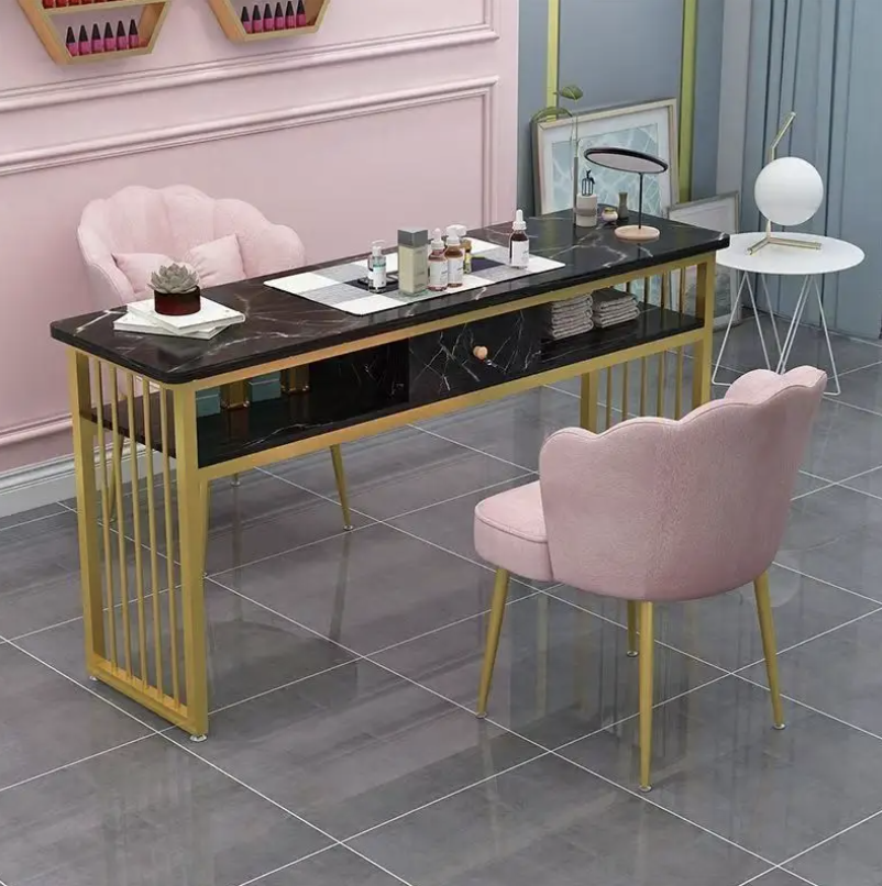 Diseñada especialmente para salones de uñas y estéticas, esta mesa combina elegancia y funcionalidad. Su marco dorado aporta un toque sofisticado, mientras que el práctico cajón en el centro ofrece un amplio espacio de almacenamiento para tus herramientas y productos.