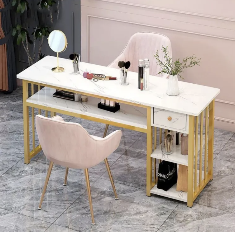 Mesa de Lujo para Salones de Uñas - Blanco Efecto Mármol con Marco Dorado y Almacenamiento Inteligente
